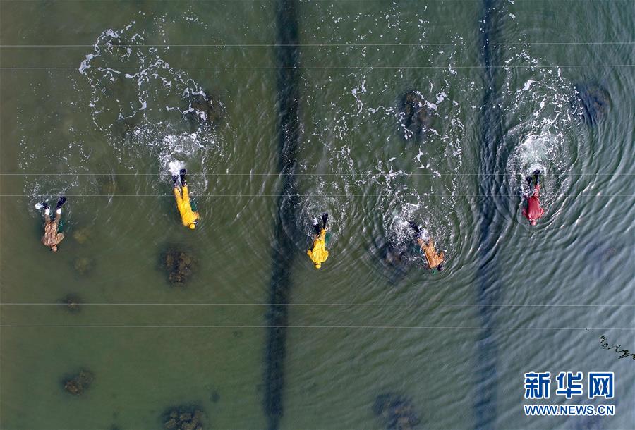 樂亭縣姜各莊鎮一處海參養殖基地的工人在捕撈海參(10月30日無人機拍攝)。