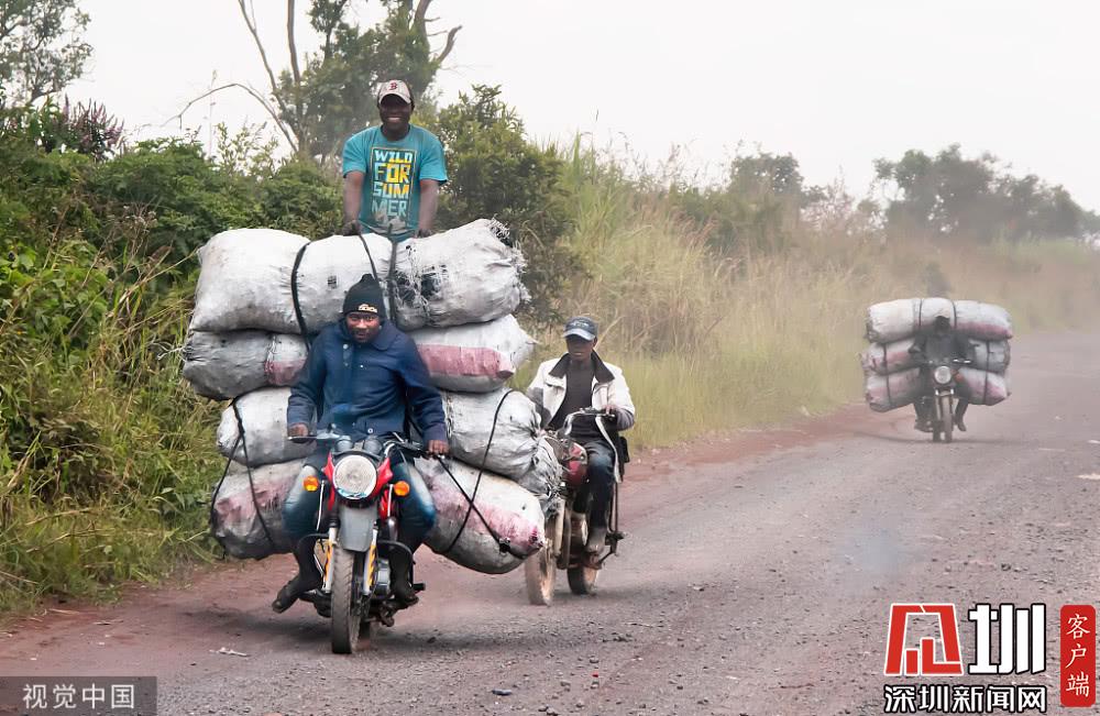 剛果,工人們將裝滿木炭的麻袋放在摩托車上,從維龍加國家公園運到剛果戈馬市。