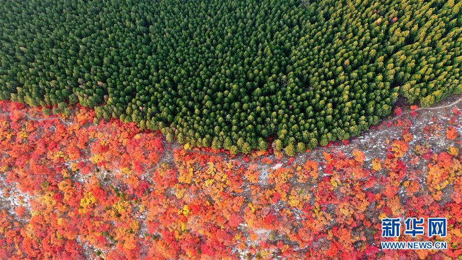 火紅的黃櫨樹林與綠色的松林沿濟南蝎子山山脊分布(11月4日無人機拍攝)。 新華社記者 朱崢 攝
