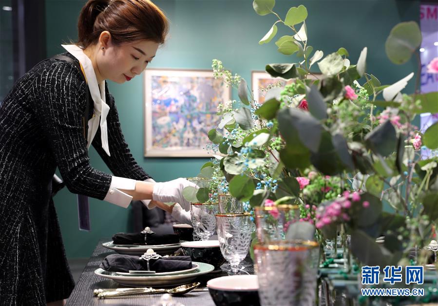 11月5日,在第二屆進博會品質生活展區,工作人員在一家丹麥家居產品的展臺前忙碌。新華社記者劉穎攝