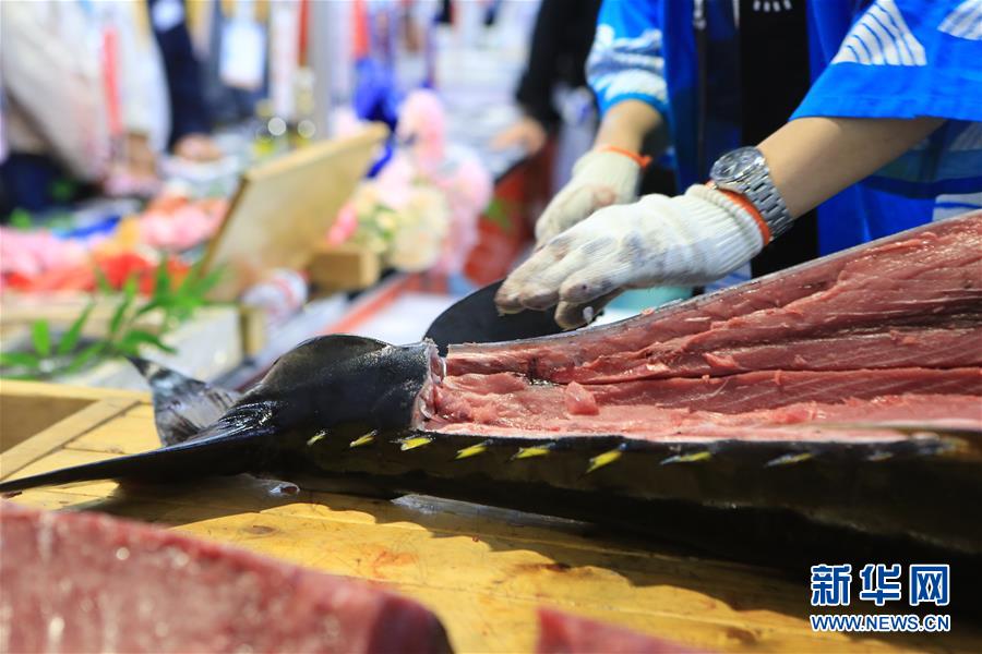 11月7日,來自日本長崎魚市株式會社的專業切魚師傅在現場解體70公斤藍鰭金槍魚。第二屆中國國際進口博覽會正在上海國家會展中心舉行。博覽會的食品及農產品展區里匯集了來自世界各地的美食,同時也上演各種精彩美食秀。11月7日,來自日本長崎魚市株式會社的專業切魚師傅現場解體一條70公斤的藍鰭金槍魚,吸引大量參觀者觀看、品嘗。新華社記者隋先凱攝