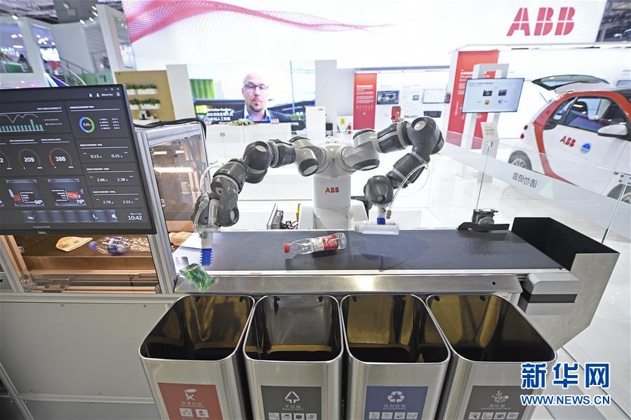 第二屆進博會瑞士ABB集團展出的人機協作雙臂機器人YuMi在進行垃圾分類演示(11月5日攝)。新華社記者王鵬攝