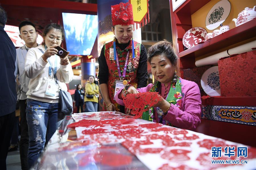 非遺傳承人田亞莉(右一)在第二屆進博會陜西非遺展區展示剪紙技藝(11月8日攝)。新華社記者王鵬攝