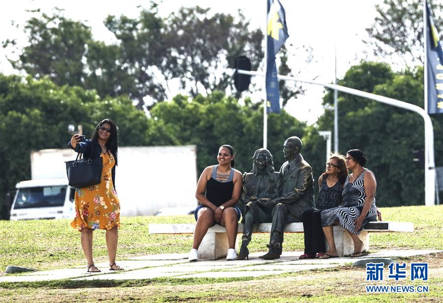 11月8日,在巴西首都巴西利亞,游客在庫比契克紀念館前與巴西前總統庫比契克夫婦的雕像合影。新華社記者 蘭紅光 攝