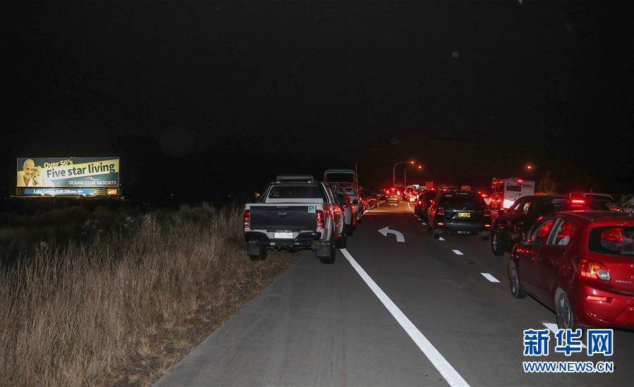 11月10日夜間,在澳大利亞新南威爾士州塔里附近道路上,由于山火封路,當地居民駕車排隊等待前往避難所。新華社記者白雪飛攝