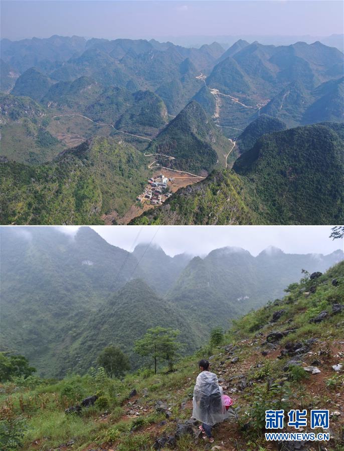 拼版照片:上圖為已經修通公路的大化瑤族自治縣板升鄉弄勇村各自然屯(11月11日無人機拍攝);下圖為在弄勇村弄炮屯,一名小學生爬山路去學校(2016年9月1日攝)。新華社記者 黃孝邦 攝