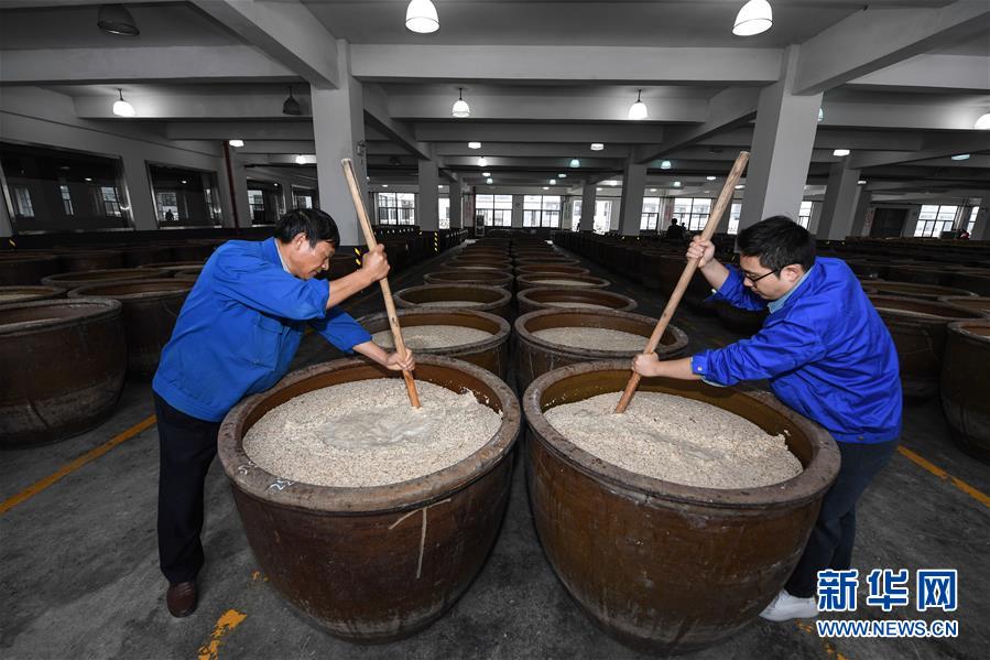 11月7日,古越龍山紹興酒股份有限公司釀酒一廠(chǎng)的工人進(jìn)行“開(kāi)耙”攪拌。新華社記者徐昱攝