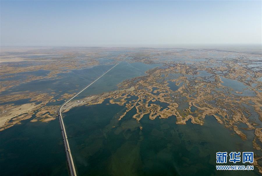 218國道在塔里木河尾閭——臺特瑪湖中間延伸(2017年10月22日無人機拍攝)。新華社記者趙戈攝