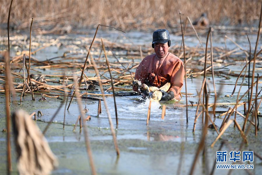 11月18日,工人在采收蓮藕。初冬時(shí)節(jié),河北省唐山市曹妃甸蓮藕豐收,工人們在結(jié)冰之前忙著采收蓮藕。新華社記者楊世堯攝