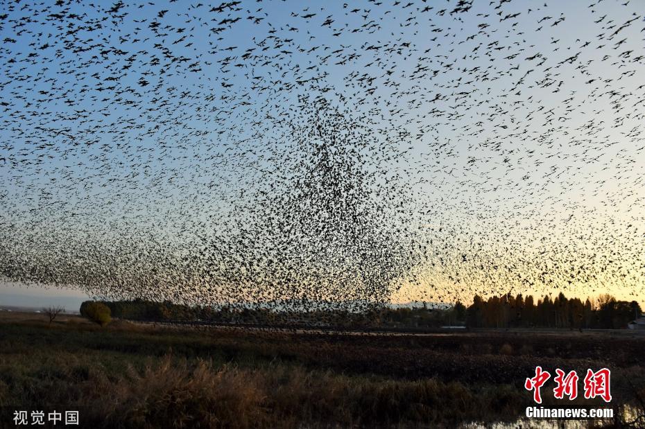 近日,土耳其穆什,椋鳥(niǎo)群遷徙途中,黑壓壓一片遮擋天空。圖片來(lái)源:視覺(jué)中國(guó)