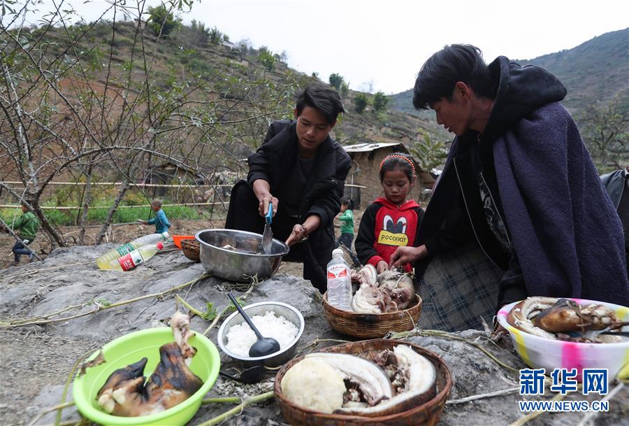 11月24日,在昭覺縣支爾莫鄉阿土列爾村,當地居民準備熟食、酒等食物祭祖,并相互贈送。11月20日至26日是四川省涼山彝族自治州大小涼山彝族群眾傳統節日——彝族年,懸崖上的阿土列爾村的彝族群眾殺年豬、祭祀和走親拜年,慶祝一年一度的彝族年。阿土列爾村是“懸崖村”,位于四川省涼山彝族自治州昭覺縣支爾莫鄉,坐落在海拔1400-1600米山坳中,這里居住著60多戶彝族群眾,村民走出大山,需要攀爬懸崖。新華社記者江宏景攝