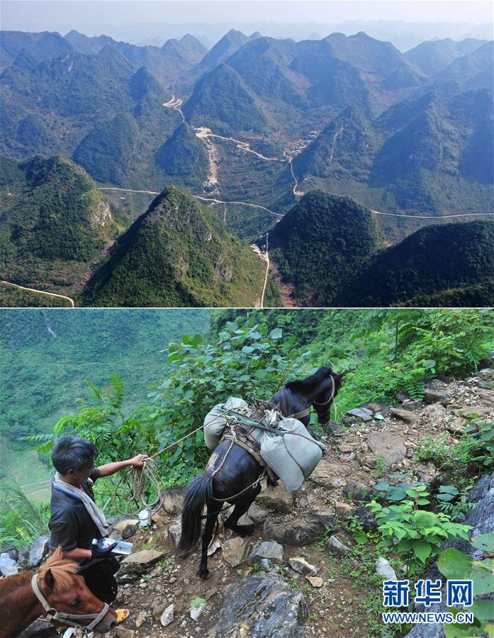 拼版照片:上圖為已經修通水泥路的大化瑤族自治縣板升鄉八好村八好屯(11月11日無人機拍攝);下圖為在尚未通路的八好村八好屯,村民背著年貨走山路回家(2016年1月26日攝)。新華社記者黃孝邦攝