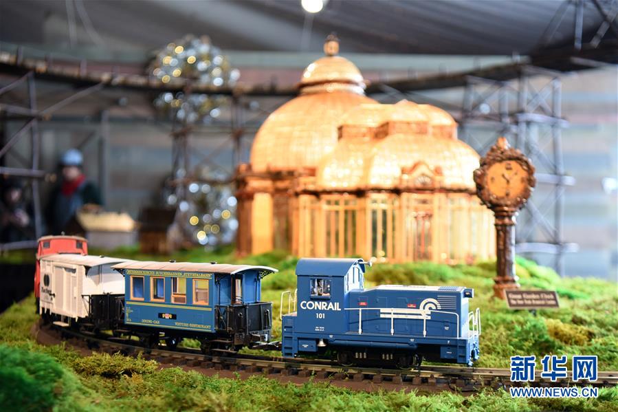 11月26日,在美國紐約植物園節日小火車展上,一輛模型小火車駛過紐約植物園溫室微縮模型。