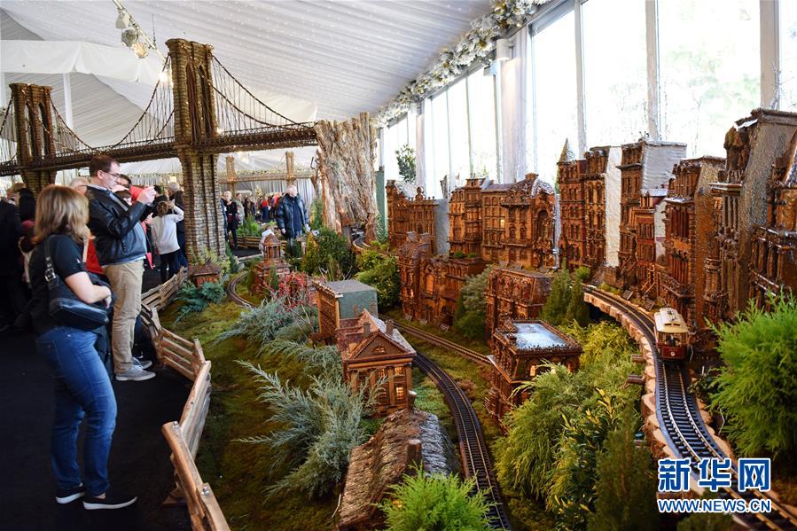 11月26日,在美國紐約植物園節日小火車展上,游客觀看模型小火車和紐約微縮景觀。新華社記者韓芳攝