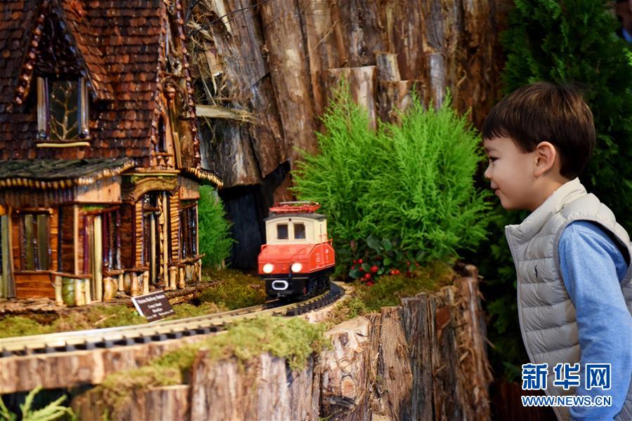 11月26日,在美國紐約植物園節日小火車展上,兒童觀看托馬斯模型小火車。新華社記者韓芳攝