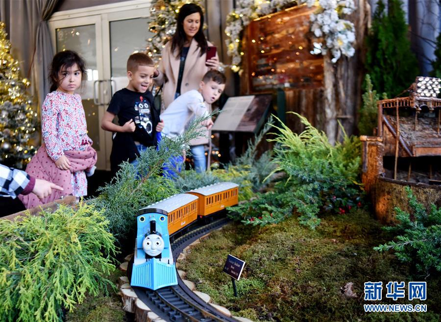 11月26日,在美國紐約植物園節日小火車展上,兒童觀看托馬斯模型小火車。新華社記者韓芳攝