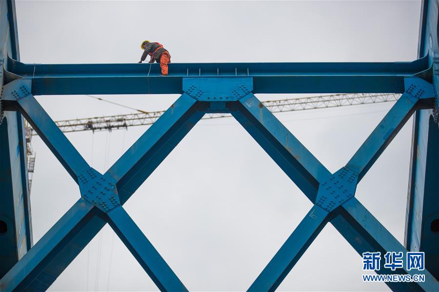 3月14日,施工人員在鴨池河特大橋上拆除輔助設施。新華社記者劉續攝