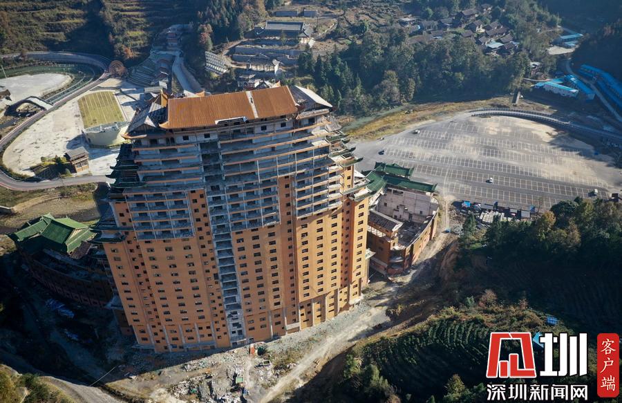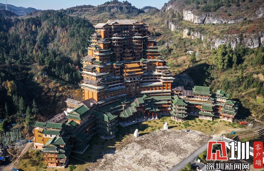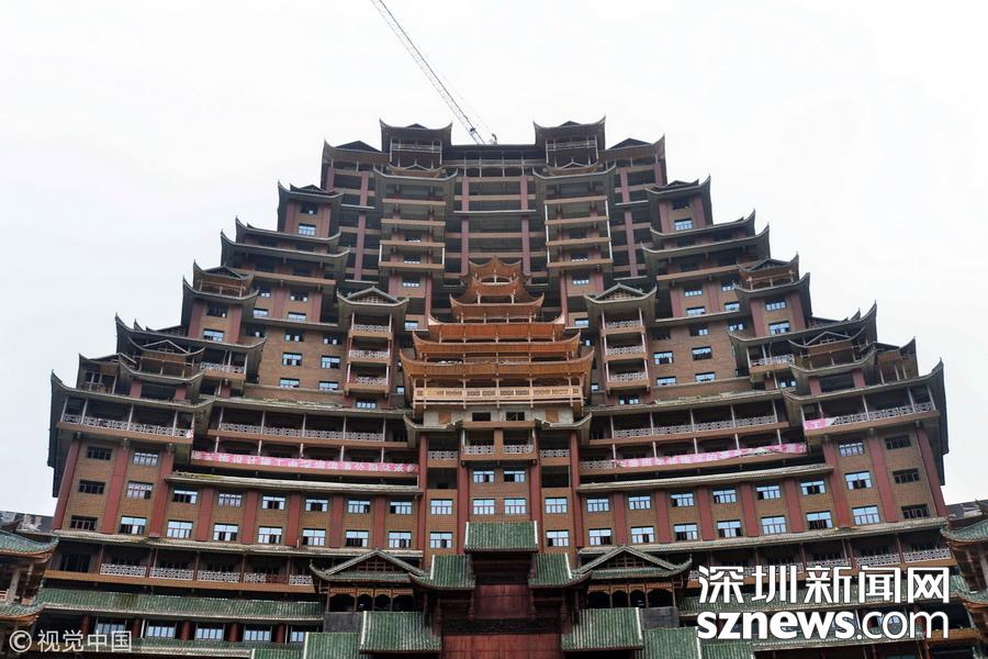 2019年12月8日,貴州省黔南布衣族自治州。位于獨山縣影山鎮凈心谷的水司府堂占地面積5900平方米,總建筑面積60000平方米,共24層,高99米,進深240米,是世界上最高最大最壯觀的水族建筑,被稱為“天下第一水司樓”。