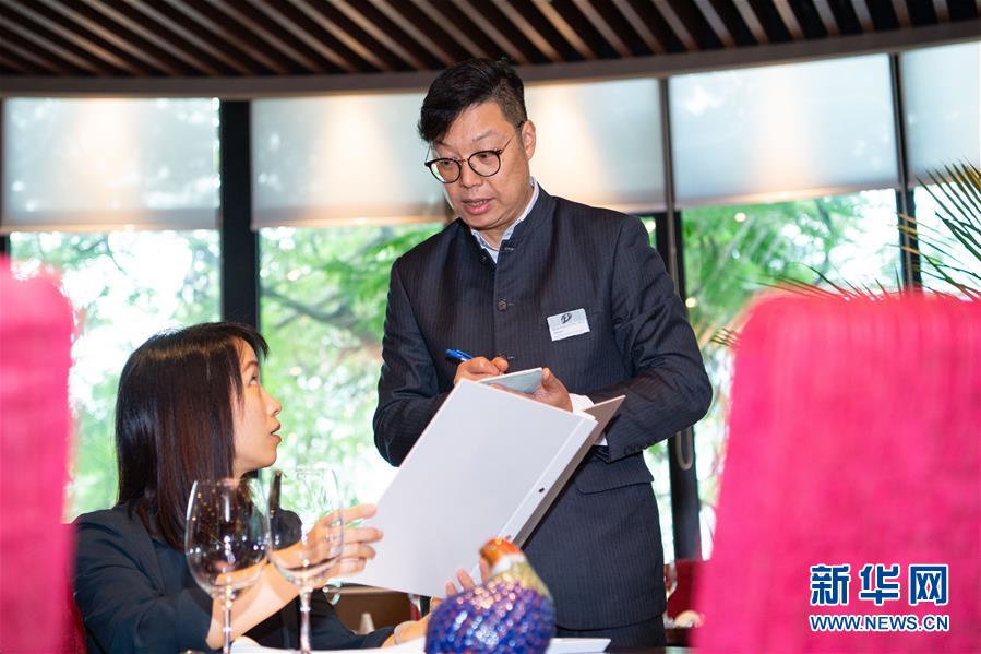 11月26日,澳門旅游學院教學餐廳的曾日升在餐廳內協助顧客點菜,他已經工作了22年,主要負責處理餐廳事項及教導學生。  新華社記者 張金加 攝