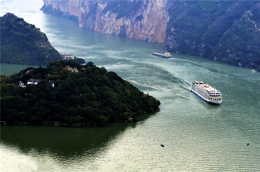 2019年11月3日,重慶,四面環水的“白帝城孤島”風貌,各種豪華游輪陸續駛往寶塔坪旅游碼頭,供游客們登島參觀。