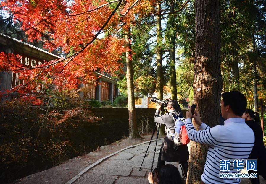 11月17日,游客在廬山如琴湖邊游玩。初冬時節,江西廬山風景區層林盡染,火紅的楓葉吸引眾多游客前來參觀,令人流連忘返。新華社記者胡晨歡攝
