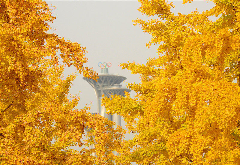 2019年11月1日,北京,深秋時節,奧林匹克公園的銀杏樹一片金黃,與鳥巢、水立方等景觀交相輝映,美不勝收。