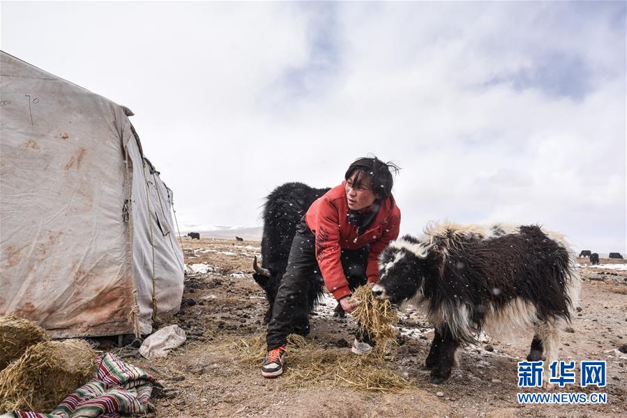 2月22日,才巴拉加在麥雄灘的帳篷前給牛犢喂飼料。今年年初,青海省玉樹藏族自治州遭遇重度雪災,部分地區積雪深度超過半米,牲畜覓食困難,餓死凍死超2萬頭只。麥雄灘位于巴顏喀拉山腳下的玉樹藏族自治州稱多縣清水河鎮文措村,是此次玉樹雪災中化雪較快、接納受災轉場外地牧民最多的地點之一。文措村黨支部書記白尕召集村民開會,大家一致同意拿出30萬畝草場,供受災更嚴重的其他地區牧民使用。新華社記者吳剛攝