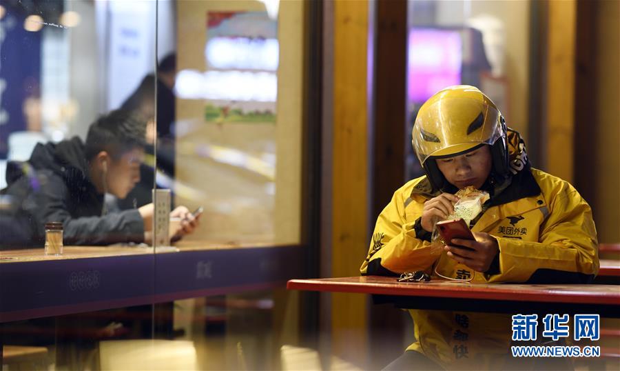 1月27日晚,送餐的間隙,來自湖南岳陽的“外賣小哥”丁鴻在一家餐廳外一邊啃面包一邊看手機。臨近春節,萬家團圓,而城市里的外賣配送員仍然騎行在街頭巷尾,將美食和春節祝福一起準時送達。新華社記者李尕攝