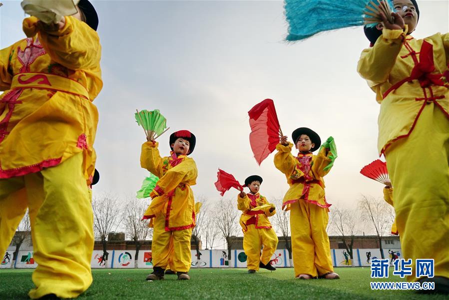 12月19日,河北省灤州市小閆營小學學生在排練地秧歌。