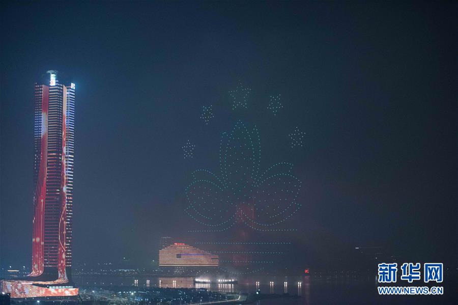 12月22日拍攝的煙花匯演上的無(wú)人機(jī)表演。當(dāng)晚,澳門(mén)與珠海首次聯(lián)合舉行煙花匯演,慶祝澳門(mén)回歸祖國(guó)20周年。新華社記者張金加攝