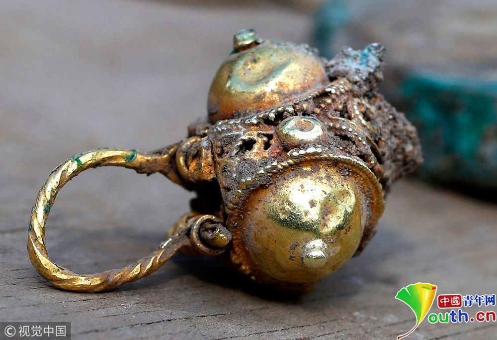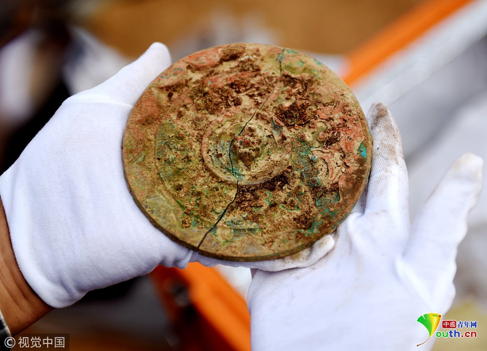 這是發掘的隨葬“搖錢樹”底座(11月15日攝)。