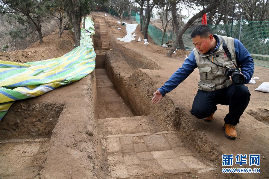 考古隊員在瑯琊臺遺址考古發(fā)掘現(xiàn)場介紹發(fā)掘出的秦漢時期的石砌道路(12月21日攝)。新華社記者李紫恒攝