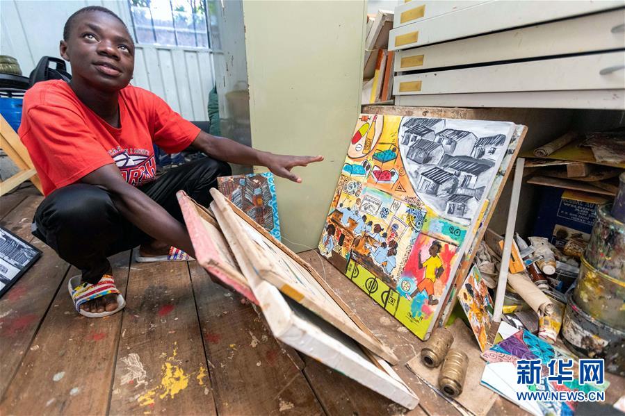 12月20日,在肯尼亞內(nèi)羅畢庫(kù)奧納藝術(shù)中心,一名畫家介紹自己的作品。 新華社記者 王騰 攝