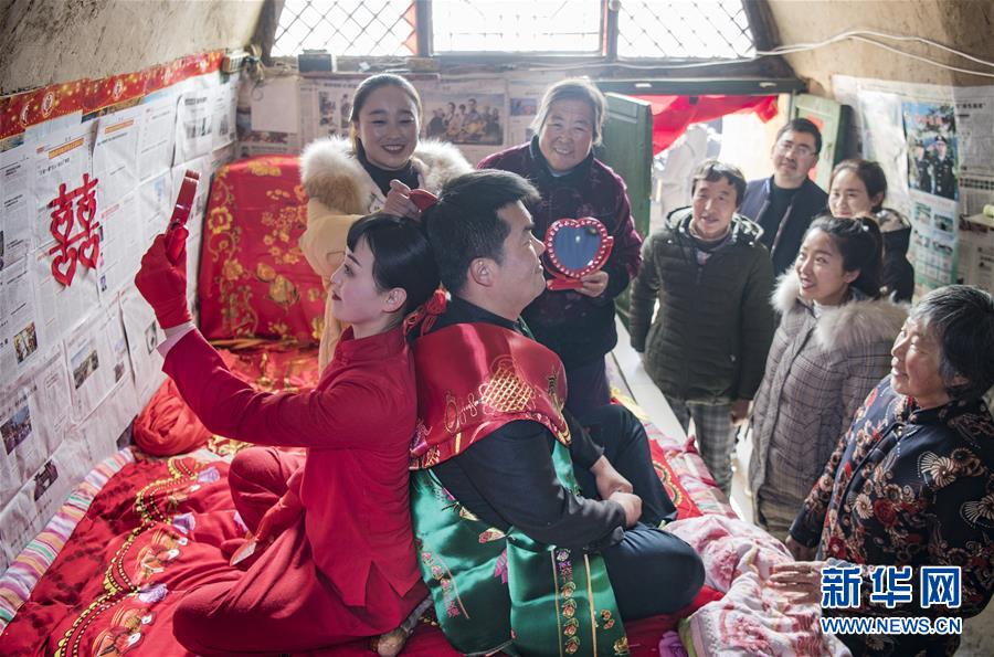 12月18日,在志丹縣金丁鎮謝灣村舉行的一場陜北婚俗表演中,鄉親們為“新人”梳理。這是婚俗中的“并頭”環節。
