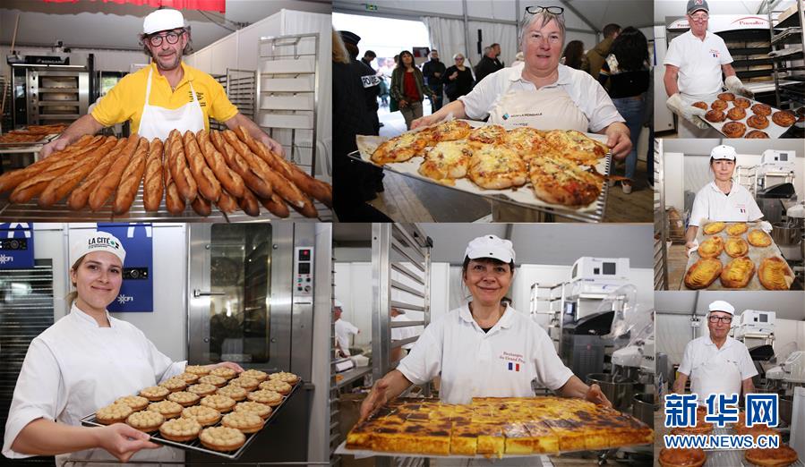 2019年5月11日,在法國(guó)巴黎圣母院附近舉行的第24屆面包節(jié)上,面包師展示新鮮出爐的面包和甜品(拼版照片)。 新華社記者 高靜 攝