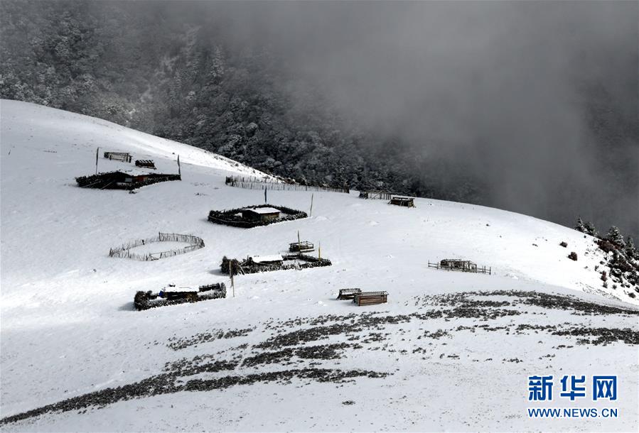 川藏線四川理塘縣境內的雪山和民居(10月17日攝)。新華社記者陳天湖攝