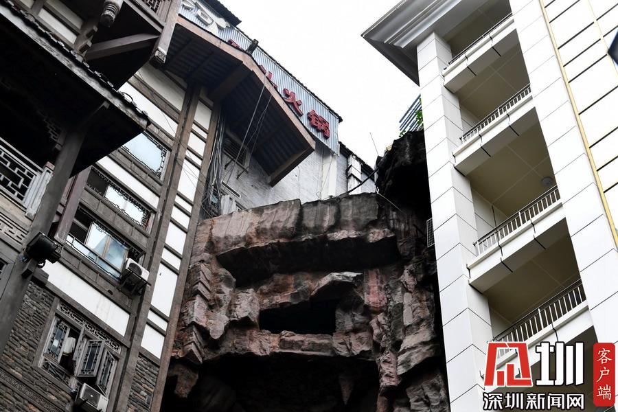 2019年10月24日,重慶渝中區,兩棟樓房中間就是斷崖,斷崖上面是車來車往的滄白路,而下方則是人來人往的洪崖洞景區,給人一種魔幻8D既視感,引發外地游客感嘆。