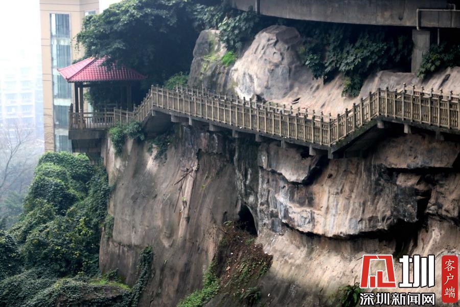 2019年1月15日,重慶市渝中區肖家灣,一小區在懸崖絕壁上修建一米寬的“懸空棧道”,方便小區市民出行,棧道離地40余米,走在上面令人膽戰心驚。