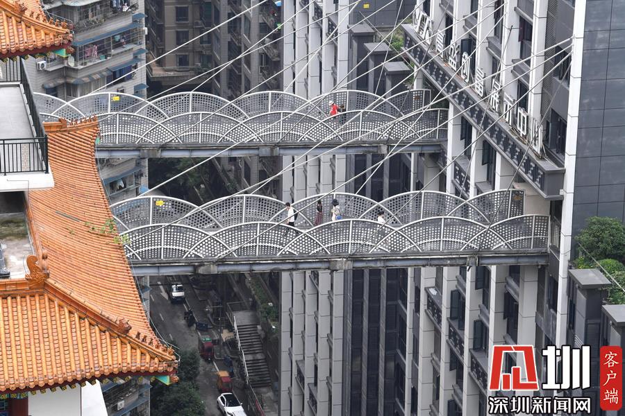 2019年6月12日,重慶臨江門的高盛創富中心1樓位于嘉陵江濱江路,但如果坐電梯上到27樓,則可以通過空中廊橋到達的魁星樓城市休閑廣場以及北區路。這兩座空中廊橋的不遠處,可以看到圣地大廈的空中廊橋。