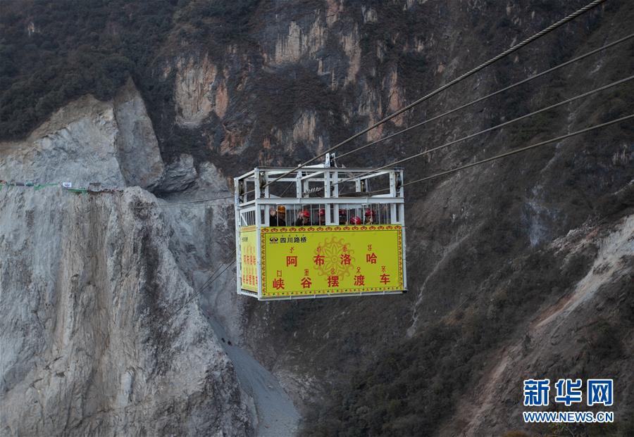阿布洛哈擺渡車載著四川路橋的工人在峽谷兩岸運行調試(2019年12月30日攝)。新華社記者江宏景攝