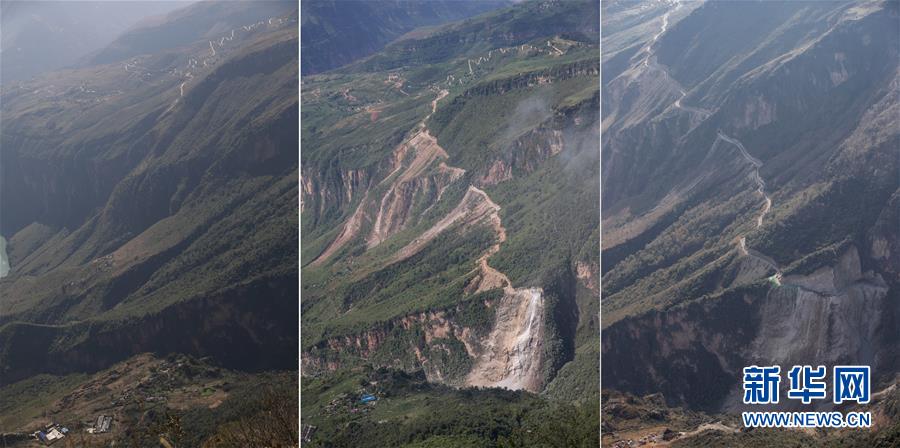 阿布洛哈村通村公路的修建過程(這是一張拼版照片,從左至右依次拍攝于2018年11月15日、2019年7月18日、2019年12月27日)。3.8公里的通村公路起于布拖縣拉果鄉偉木村,止于烏依鄉阿布洛哈村村委會。新華社記者江宏景攝