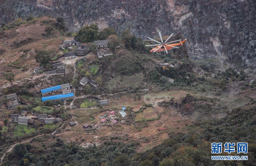 米-26重型直升機吊運一臺挖掘機飛抵阿布洛哈村上空(2019年12月5日攝)。通村公路的施工單位四川路橋租用一架米-26重型運輸直升機,克服高山峽谷、天氣多變等不利因素,從布拖縣城吊運大型施工設備到阿布洛哈村,為兩邊分頭掘進施工提供大型機械保障。新華社記者江宏景攝