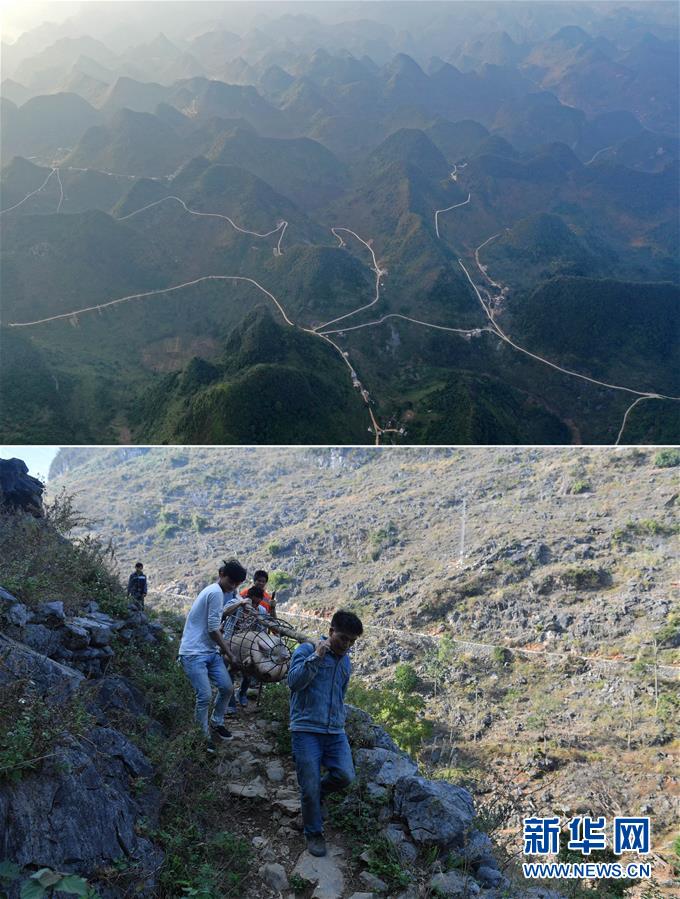 拼版照片:上圖為已經修通水泥路的大化瑤族自治縣板升鄉八好村八好屯(11月11日無人機拍攝);下圖為在尚未通路的八好村八好屯,村民背著年貨走山路回家(2016年1月26日攝)。新華社記者黃孝邦攝