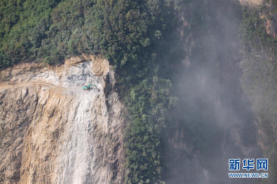 阿布洛哈村通村公路施工遇到陡崖夾溝地勢,項目進程艱難緩慢,四川路橋施工隊伍開始在峽谷兩邊分頭推進(2019年11月20日攝)。新華社記者江宏景攝