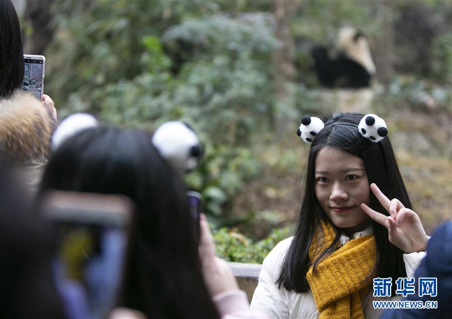 1月1日,在成都大熊貓繁育研究基地,游客在與大熊貓合影。 新華社記者 李夢馨 攝