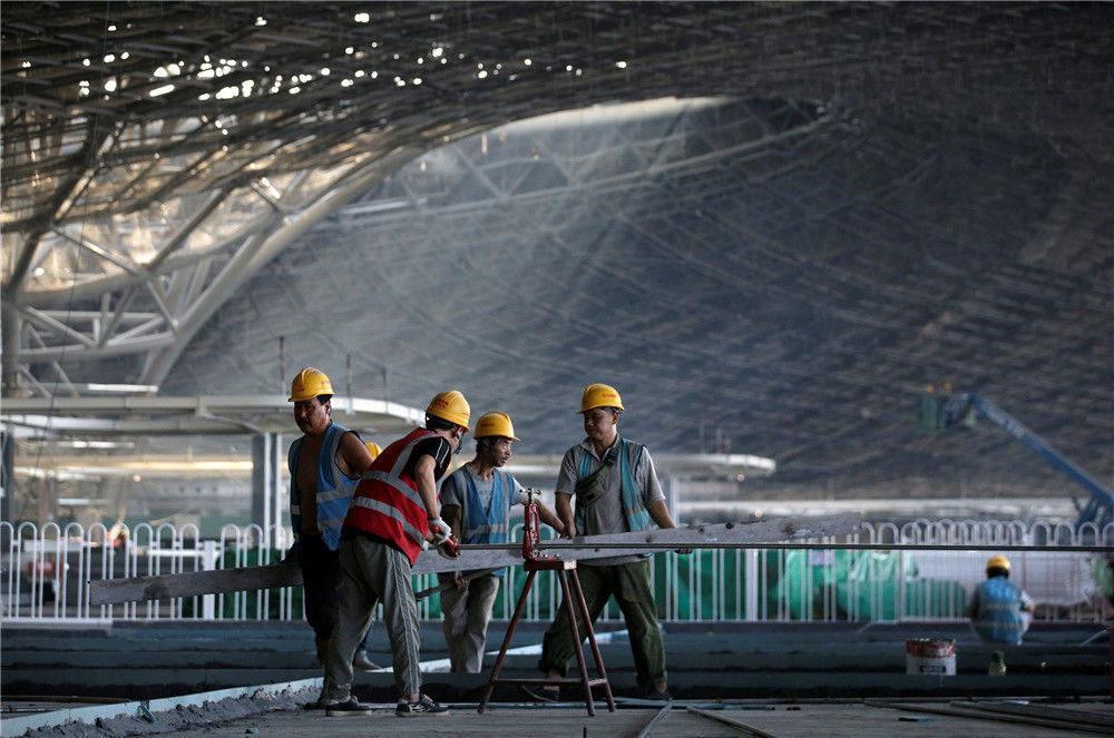 工人在北京大興國際機場主航站樓內進行施工作業(2018年12月29日攝)。新華社記者鞠煥宗攝