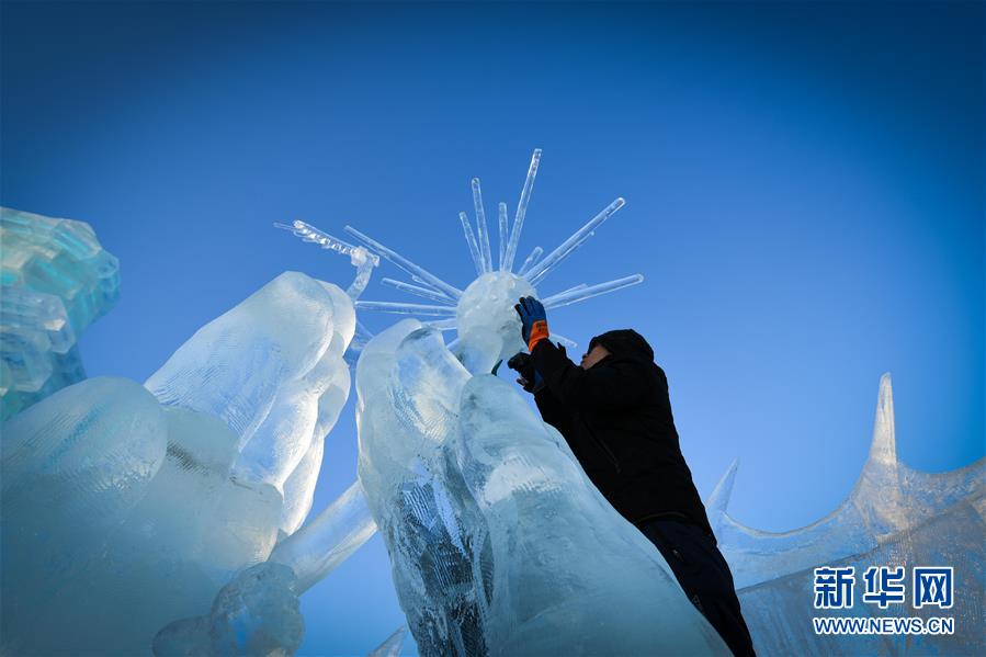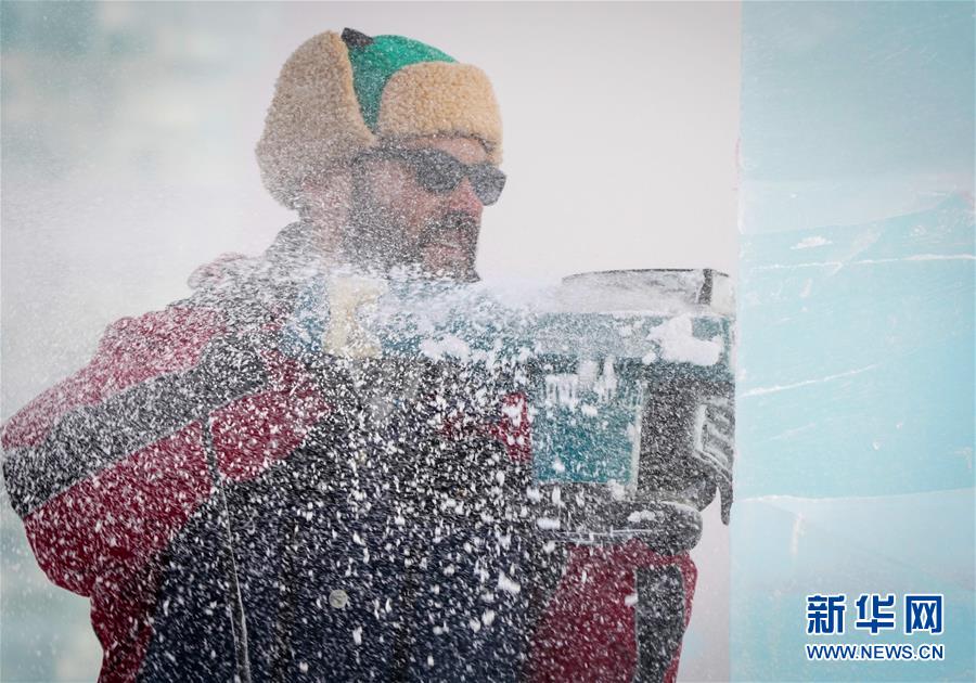 第九屆中國·哈爾濱國際組合冰雕比賽選手在哈爾濱冰雪大世界內制作冰雕(1月2日攝)。新華社記者王松攝