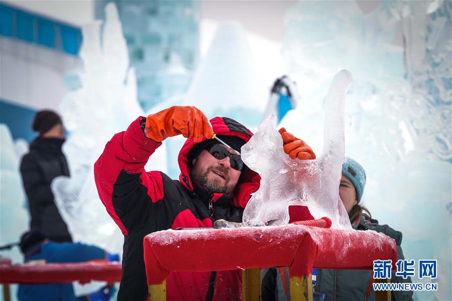 選手在第九屆中國·哈爾濱國際組合冰雕比賽中進行冰雕創作(2019年12月31日攝)。新華社記者王松攝
