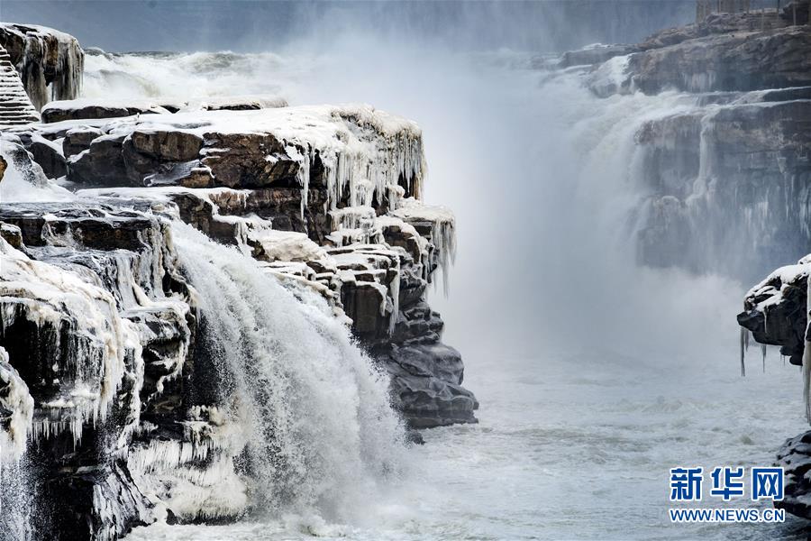 1月12日,黃河壺口瀑布景區內的冰瀑與流動的瀑布形成一幅獨特的景觀。新華社記者陶明攝
