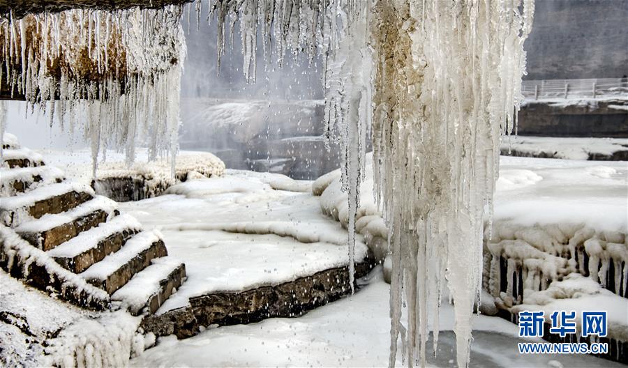 1月12日拍攝的陜西黃河壺口瀑布景區(qū)內(nèi)“冰峰倒掛”景觀。新華社記者陶明攝